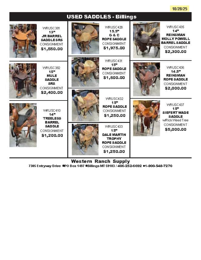 Western Ranch Supply offers a carefully selected assortment of high-quality used saddles and equipment. Find great deals on gently used tack, perfect for riders and ranchers on a budget. Our selection changes frequently, so be sure to check back often. Not only can you find your next favorite piece at Western Ranch Supply, but we also offer consignment opportunities for those looking to sell their gently used saddles and equipment. Let us help you find the perfect match or turn your unwanted gear into cash!