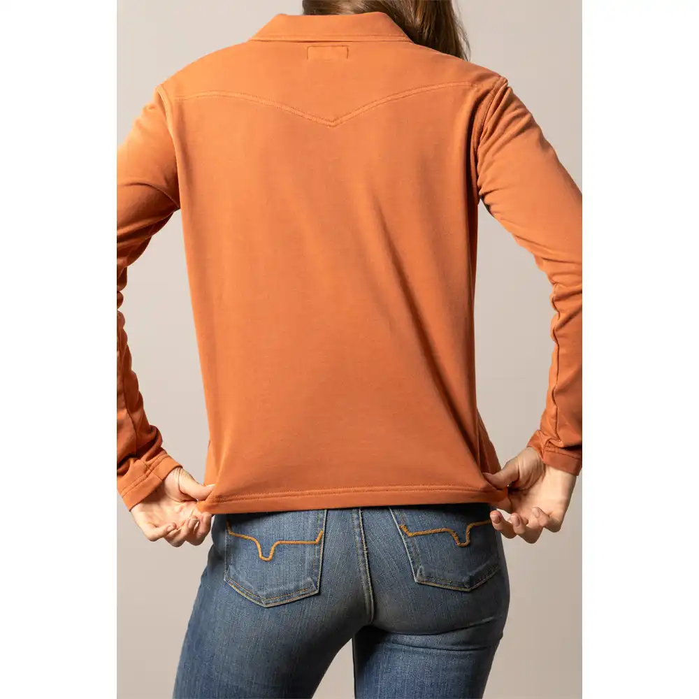 Long-sleeve collared pullover shirt, open half-placket neckline, western-style yoke, subtle horn logo on the left chest.