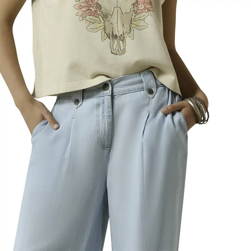 Slouchy and loose with a mid rise fit, these lightweight pants are all-day cool and comfortable. Western button details add character while the relaxed cut makes them perfect for warm-weather wear.