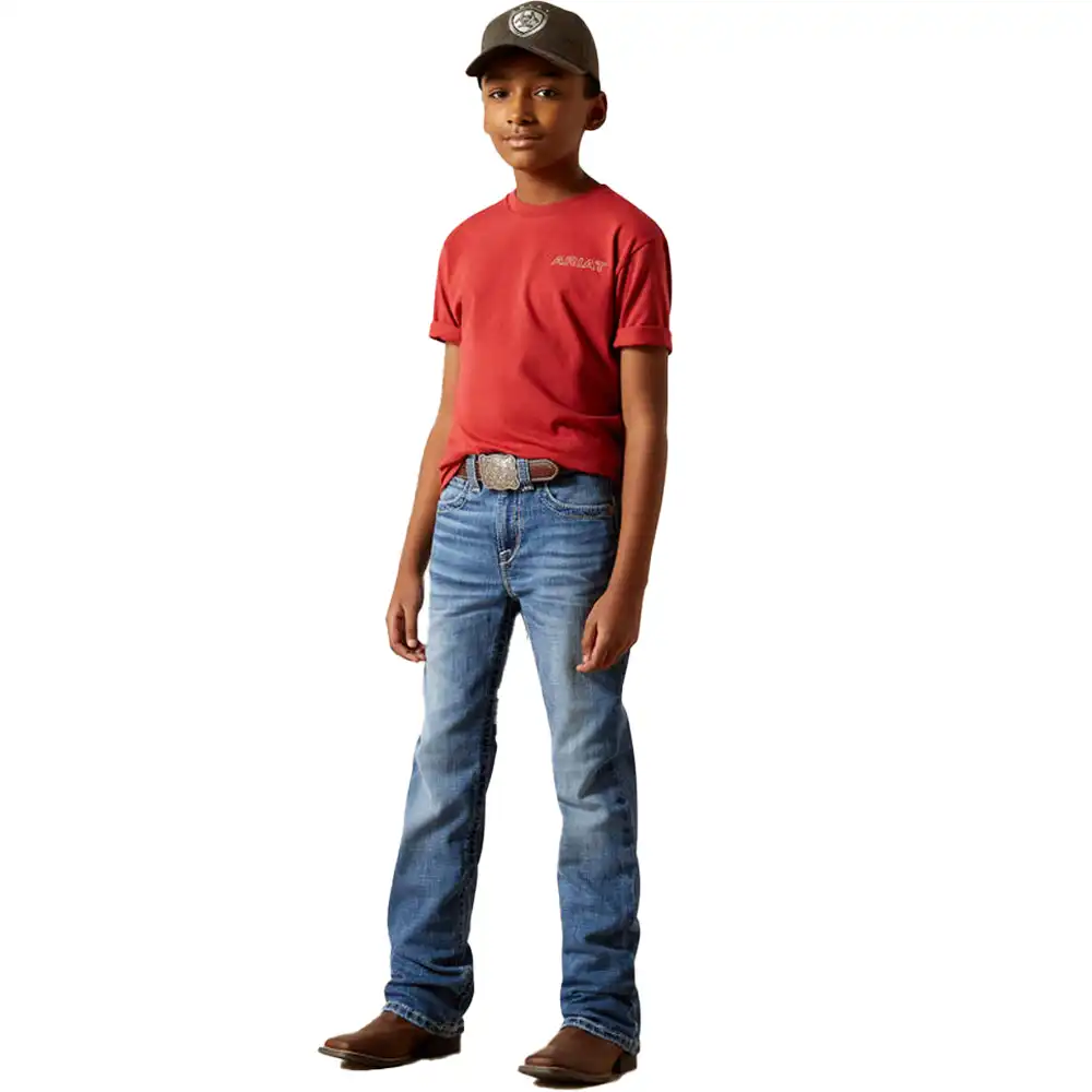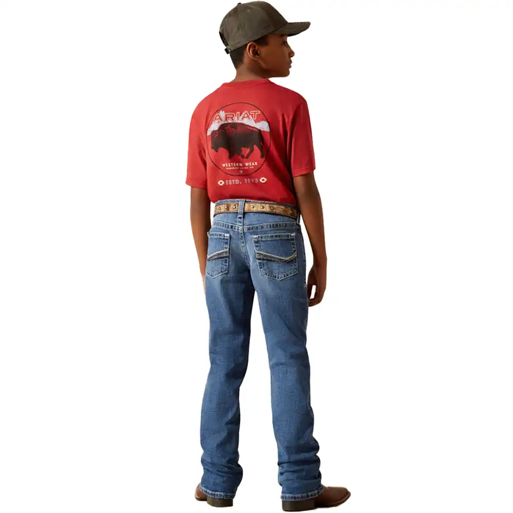 The comfortable, durable jeans Ariatยฎ is known forโin his perfect size. This loose-fitting pair is made for riding, playing, or just running around.