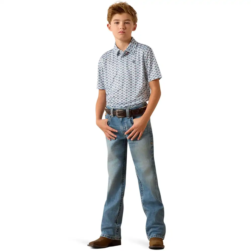 The comfortable, durable jeans Ariatยฎ is known forโin his perfect size. This slim-fitting pair is made for riding, playing, or just running around.