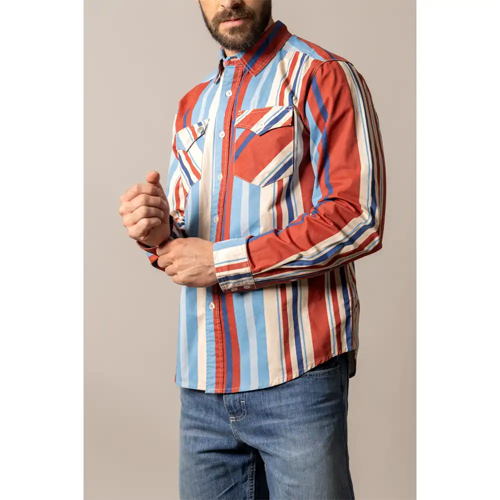The 90s Western style of the Clancy is designed and destined to be your next go-to statement piece. This comfortable, retro-inspired button-down shows off a bold, vertical stripe pattern throughout the body and sleeves that contrasts with the offset-patterned double chest pockets. This long sleeve shirt perfectly blends standout style with everyday wearability. The Clancy is cool, and is sure to become a favorite in your closet. The thicker cotton gives a true brush popper feel.