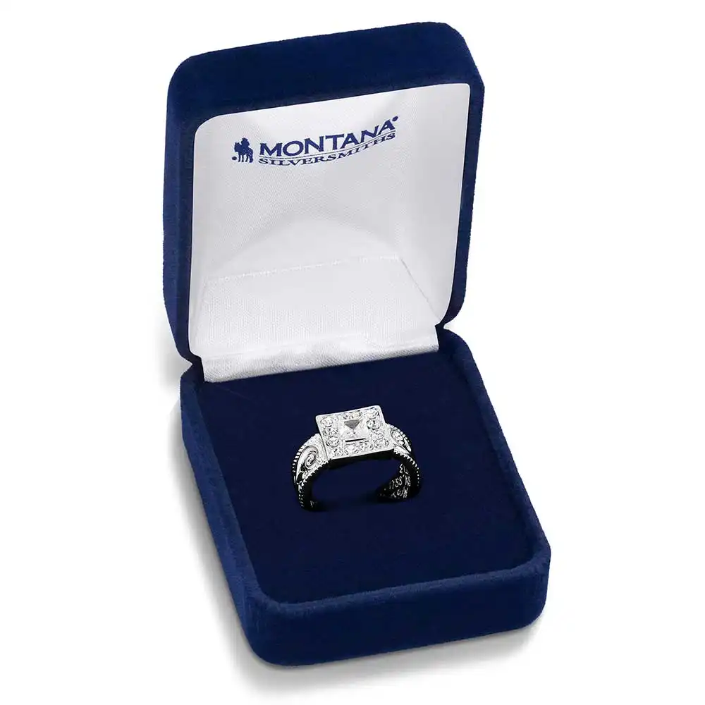 Sleek design meets Southwestern style, the Desert Whirl Engraved Ring is a square cuff style ring featuring a silver finish and clear crystals for an elegant shine. Engraved detailing adds textured, Southwestern inspired charm, making it a standout piece for everyday wear or special occasions. It blends rugged charm with polished elegance, making it a versatile addition to any jewelry collection. One size fits most.