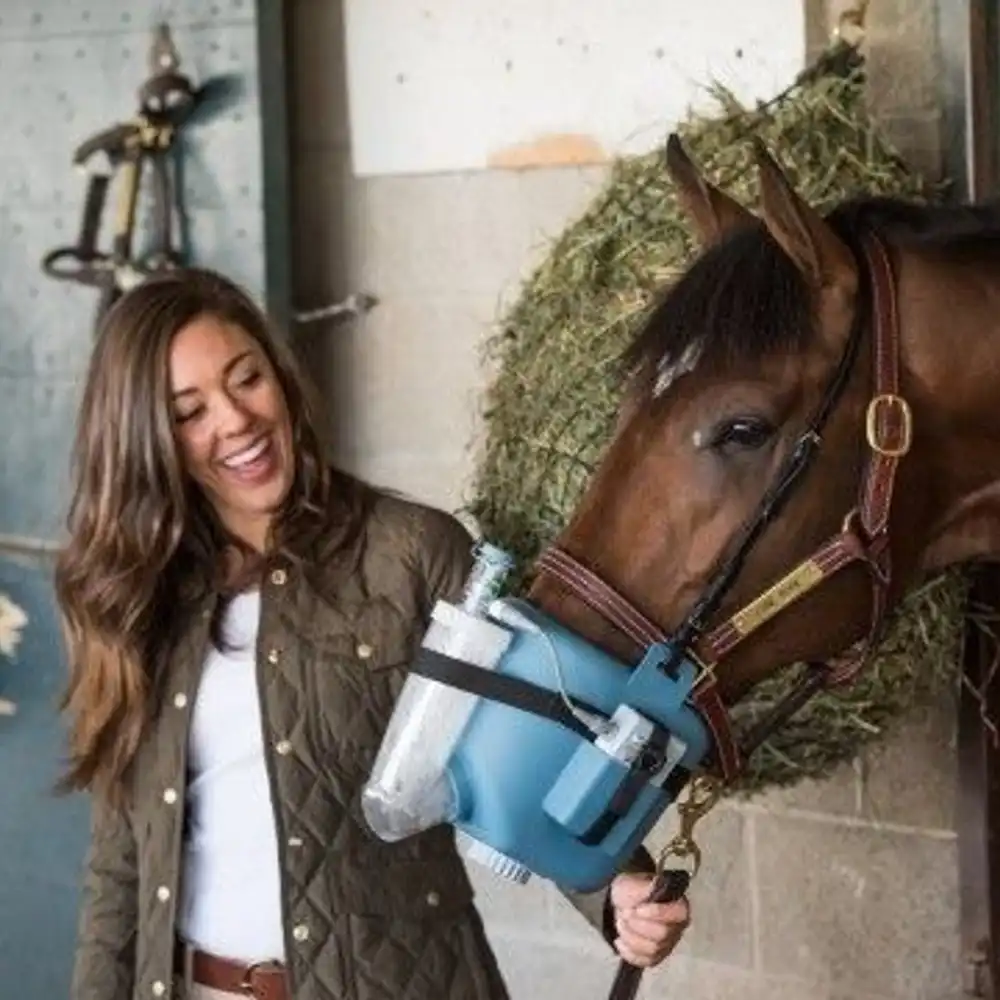 The Flexineb E3 System is a portable, silent, highly effective equine nebulizer that delivers aerosolized medications and natural therapies to the airways of the horse. The soft flexible mask fits over the face of the horse and creates a seal by tightening the strap around the head. Since the battery is rechargeable, the Flexineb unit may be placed on the horse while walking so that deeper respiratory function is encouraged.