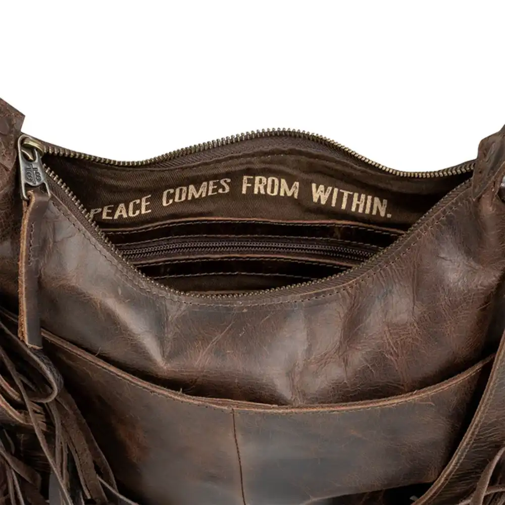 The Guadalupe Serape Nellie Fringe Bag captures the essence of fall with its rich palette of browns, creams, grays and black colors and is crafted from hand-woven cotton with full grain leather accents for a timeless rustic charm.