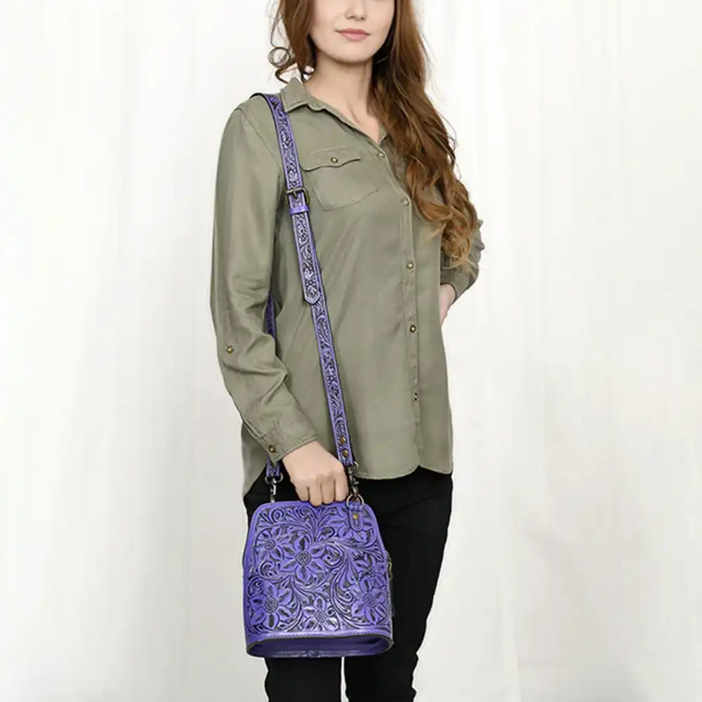 Step out in authentic Western style with this beautifully handcrafted crossbody bag by American Darling. Made from premium vegetable-tanned leather, this bag features a stunning dual-texture design. The front is adorned with intricate, deep hand-tooled floral carving, while the back showcases a soft, leather pattern, offering both rugged durability and luxurious comfort against your side.