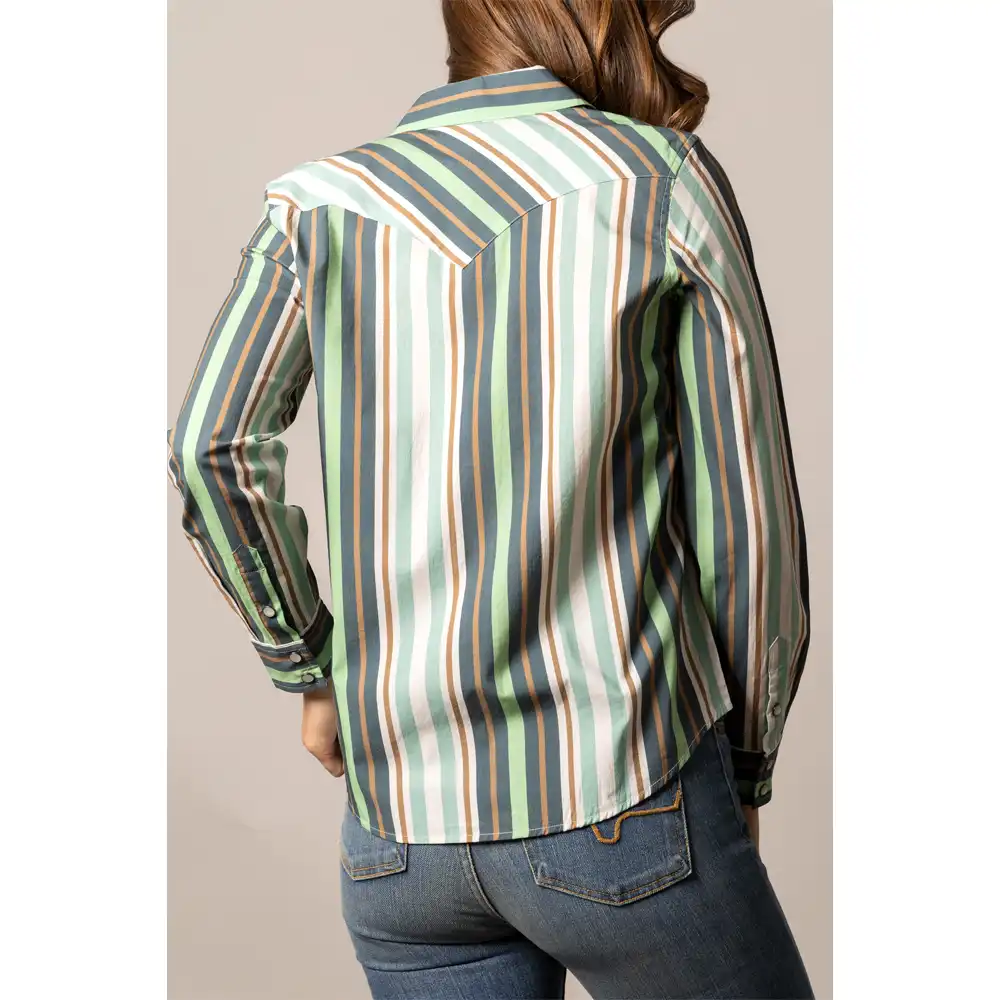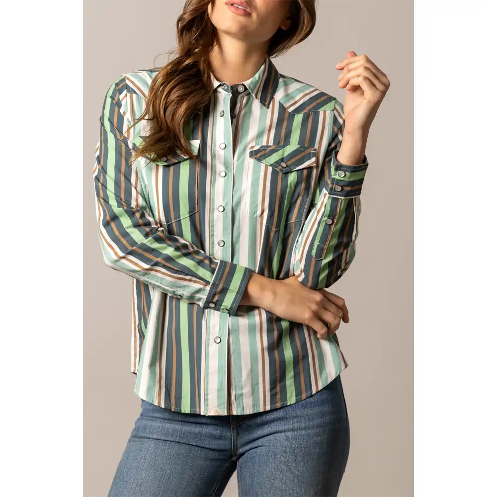 Lightweight striped Coolmax® western shirt with pearl snap front, collared neckline, and dual chest pockets.