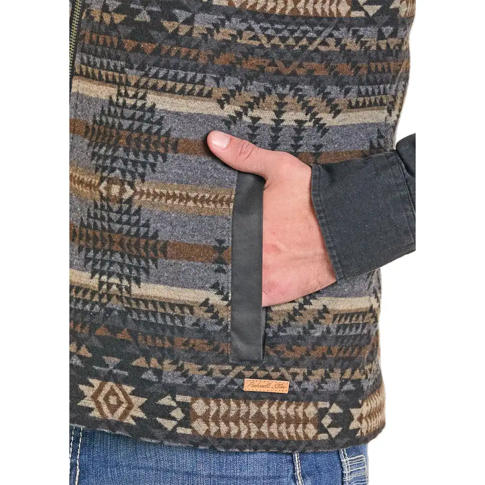 The Jacquard Aztec Printed Vest combines comfort with a southwestern aesthetic. Crafted from 90% polyester and 10% wool, this vest features an Aztec print, oilskin yokes, and a zip-up closure. The sleeveless design and wool blend fabric provide both warmth and versatility, making it a great layering option.