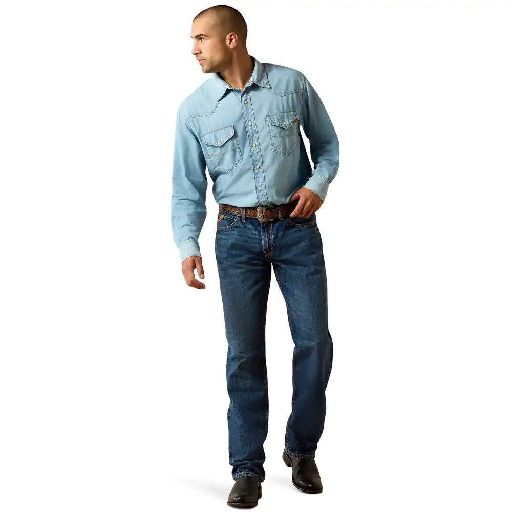 Call it iconic. Lightweight and authentically styled, this denim shirt features a pointed yoke, flap pockets, and snap closures. Wear it as a layer or pair it with your favorite Ariatยฎ jeans for a denim-on-denim look.