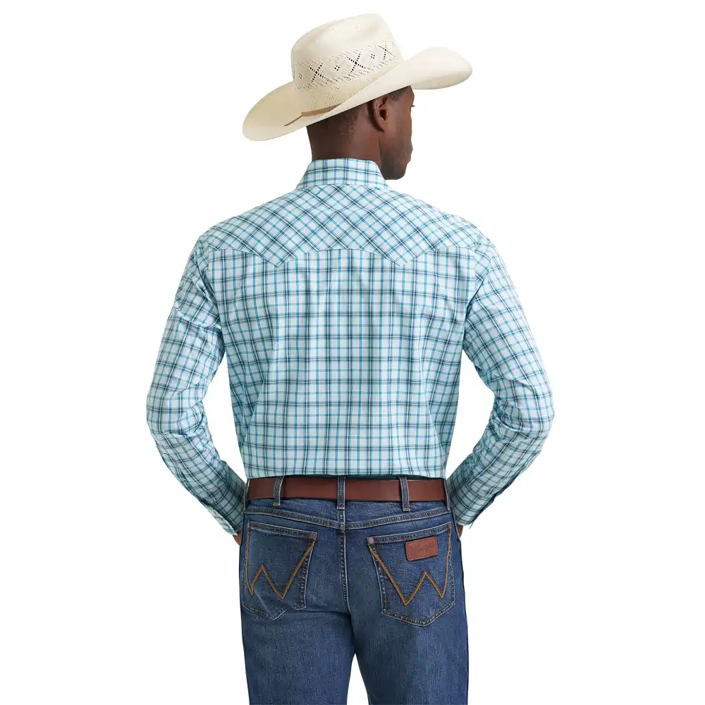 Paying tribute to our Western roots, the men’s Wrangler Retro® long-sleeve sawtooth snap pocket western shirt gives the classic style you know a modern look and feel. It comes with all the same details you love, including a spread collar, pointed yokes, and two sawtooth snap flap pockets with embroidery to add a bold element to every outfit. Plus, it features a modern fit and it’s crafted from cotton for comfort and long-lasting durability, no matter how often you wear it. Wear it with a pair of Wrangler Retro bootcut jeans to complete the look for any occasion.