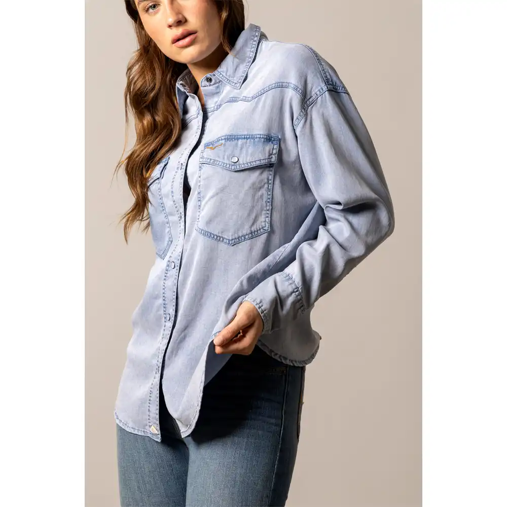 Collared denim button-up with matte pearl snap closures, decorative western yoke, and double chest pockets.
