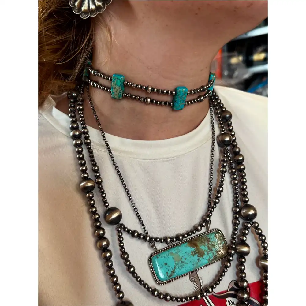 This double strand choker-style necklace measures 13 inches with an extender and is crafted with 4mm and 6mm sterling silver pearls. It features stunning rectangle variscite beads with rich, earthy tones. Though it may look compact when hanging, it lays beautifully on the neck once worn. Finished with a sterling silver lobster clasp and extender. Limited edition – only a few were made.