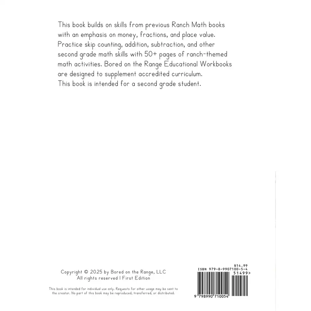This book builds on skills from previous Ranch Math books with an emphasis on money, fractions, and place value. Practice skip counting, addition, subtraction, and other second grade math skills with 50+ pages of ranch-themed math activities. Bored on the Range Educational Workbooks are designed to supplement accredited curriculum.