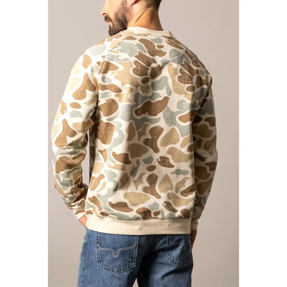 Pullover with longhorn logo across the body, ribbed sleeves and hem, button placket, and a half-moon coverstitch detail at the back.