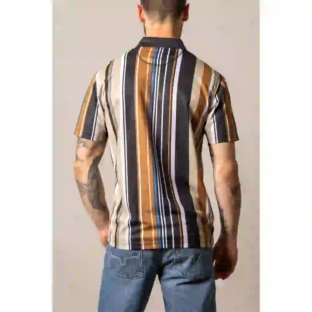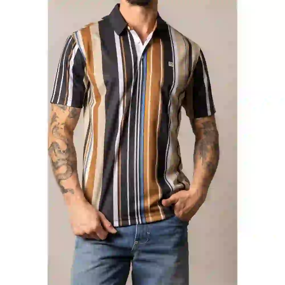 Piquรฉ knit polo with an all-over stripe pattern, woven chest patch, solid collar, and button placket.