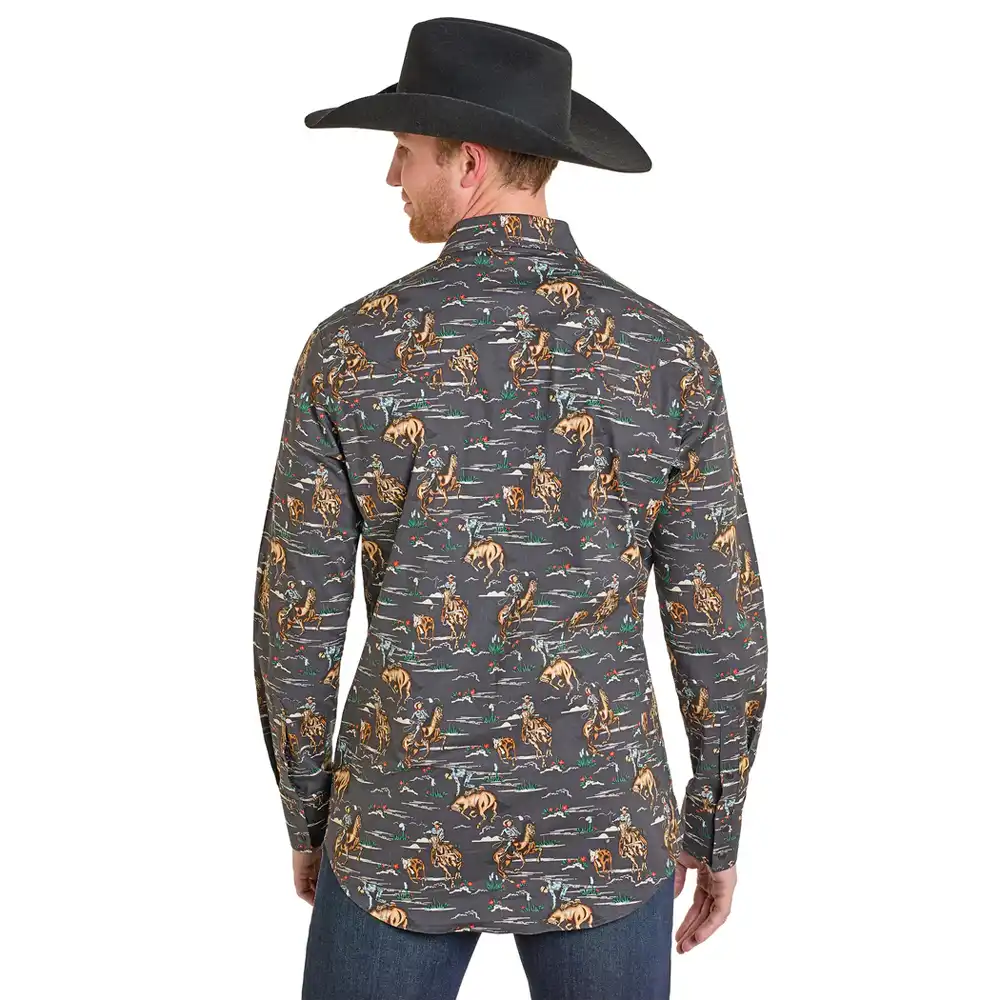Showcase your style in this Slim Fit Long Sleeve Snap Shirt. Featuring a wild west cowboy print, this shirt is made from 97% Polyester and 3% spandex for a comfortable, flexible fit. The snap closures add functionality, while the double chest pockets provide extra storage. Ideal for making a statement on any occasion.