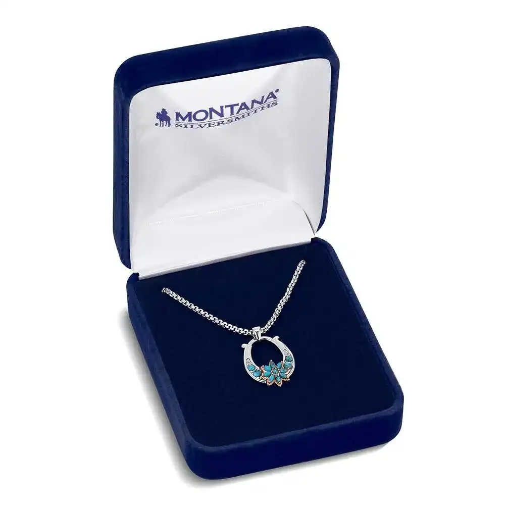 Fresh and vibrant, the Spring Pastures Necklace features a cluster of bright turquoise accents blooming in a horseshoe design. This piece has a 19 inch chain and brings a joyful, lucky energy to any outfit. Stone color may vary.
