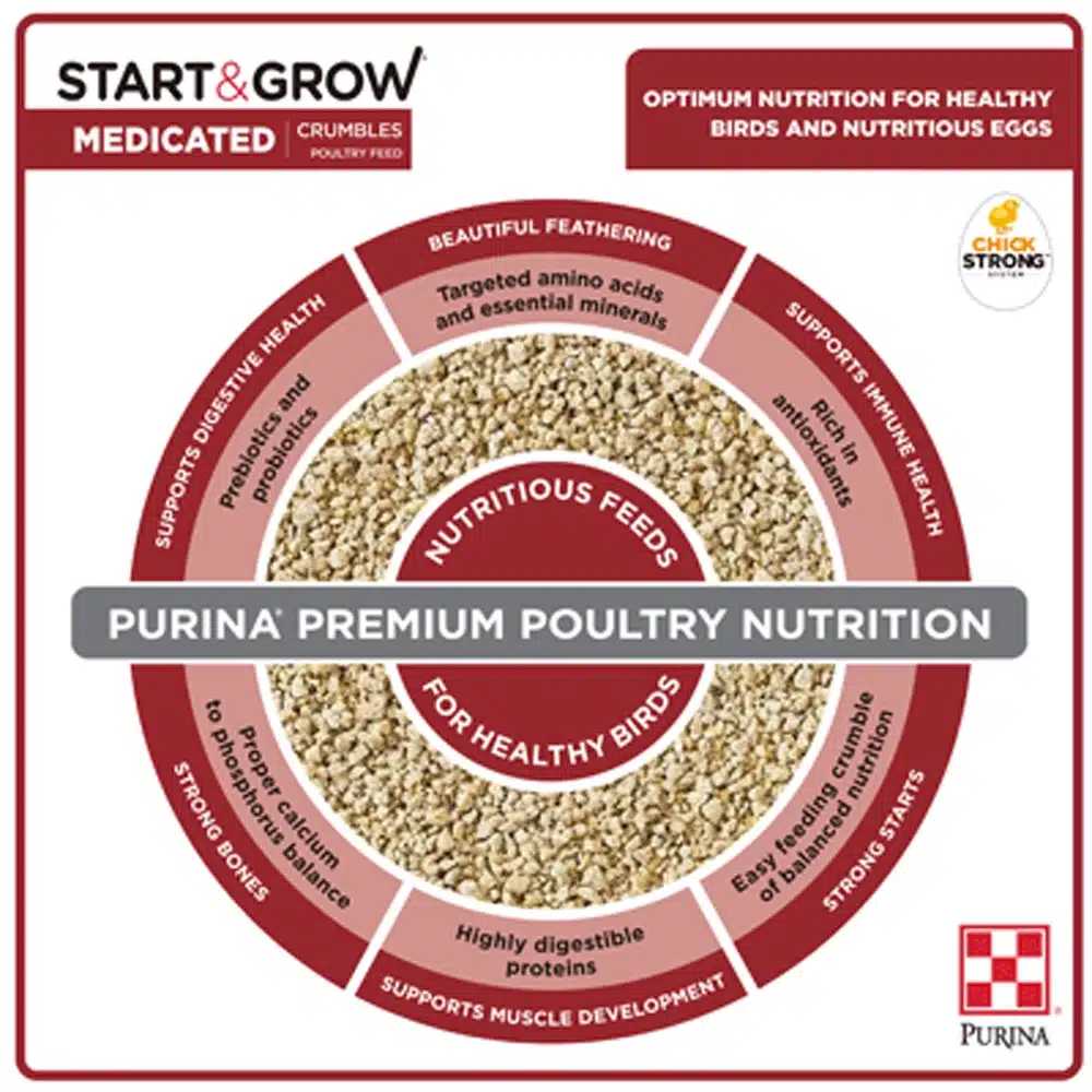 Greatness starts on day one. Purina® Start & Grow® Medicated chicken feed contains amprolium (not an antiboitic) to aid in the prevention of coccidiosis. Our feed gives your chicks a strong start and enhances early hen development. Raise chicks from day one to laying age (18-20 weeks) with feed that supports their digestive health and immune function – and aids in the protection against coccidiosis where immunity is not desired.
