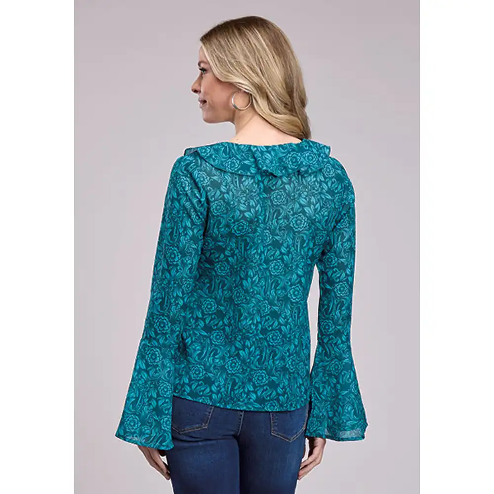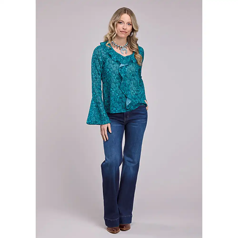 Women’s Very Pretty Peasant Top In Poly Georgette “Teal Tooled Floral” Print