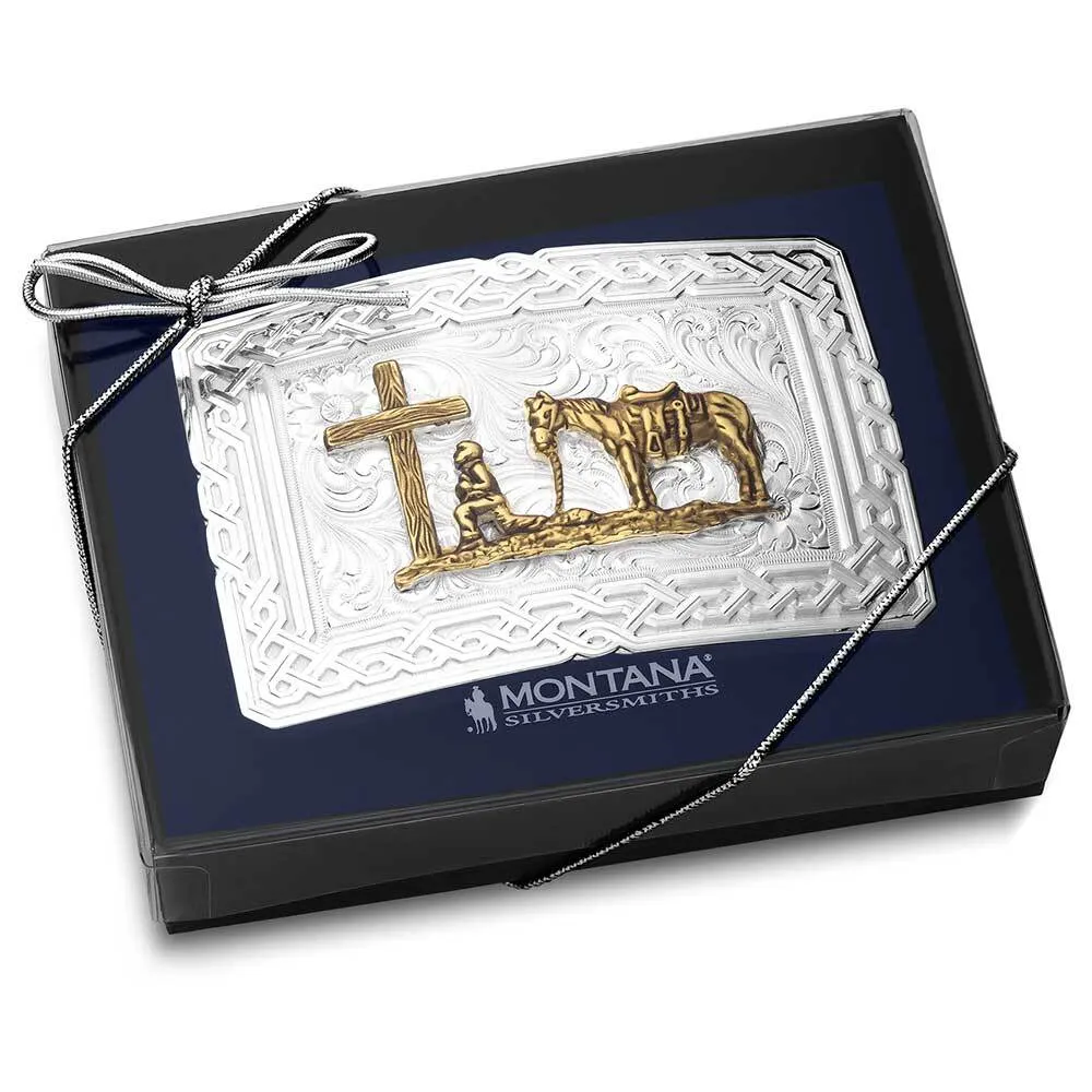 Show off your faith and devotion with the Unyielding Grit Belt Buckle. This rectangular buckle features a large, antiqued gold tone Christian cowboy figure kneeling before a cross while his horse stands attentively nearby. The cowboy and horse figure is antiqued to show each detail and stands against a stunning silver plated backdrop. Additionally, there is a showstopping geometric engraving along the border of the buckle. This buckle has a standard 1.5 inch swivel.