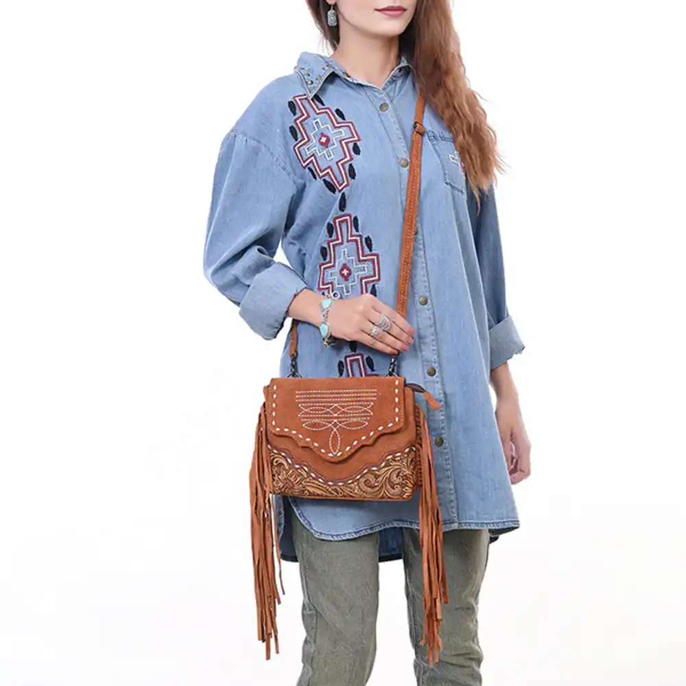 Crafted from eco-friendly vegetable-tanned genuine suede leather, this American Darling cross body bag delivers rugged durability blended with refined artisan craftsmanship. The full-grain leather offers a soft, supple feel, while the compact structure ensures comfortable wear throughout the day. Boot stitching, buck stitching, and hand-tooled floral detailing highlight the traditional Western artistry that defines the brand.