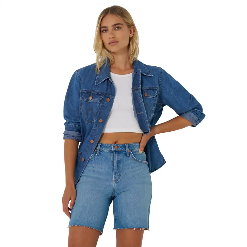 Flattering and full of attitude, the Women’s Longline Cowboy Short is your go-to for warmer days. Crafted from a cotton blend with a hint of stretch, these slim-fit cutoffs deliver comfort that lasts all day. A longer 7″ inseam and raw hem give them a laidback vibe with minimal fray. These high-rise denim shorts are finished with the signature five-pocket styling, โWโ stitching, and a logo patch, bringing authentic Wranglerยฎ heritage to every outfit in the season ahead.