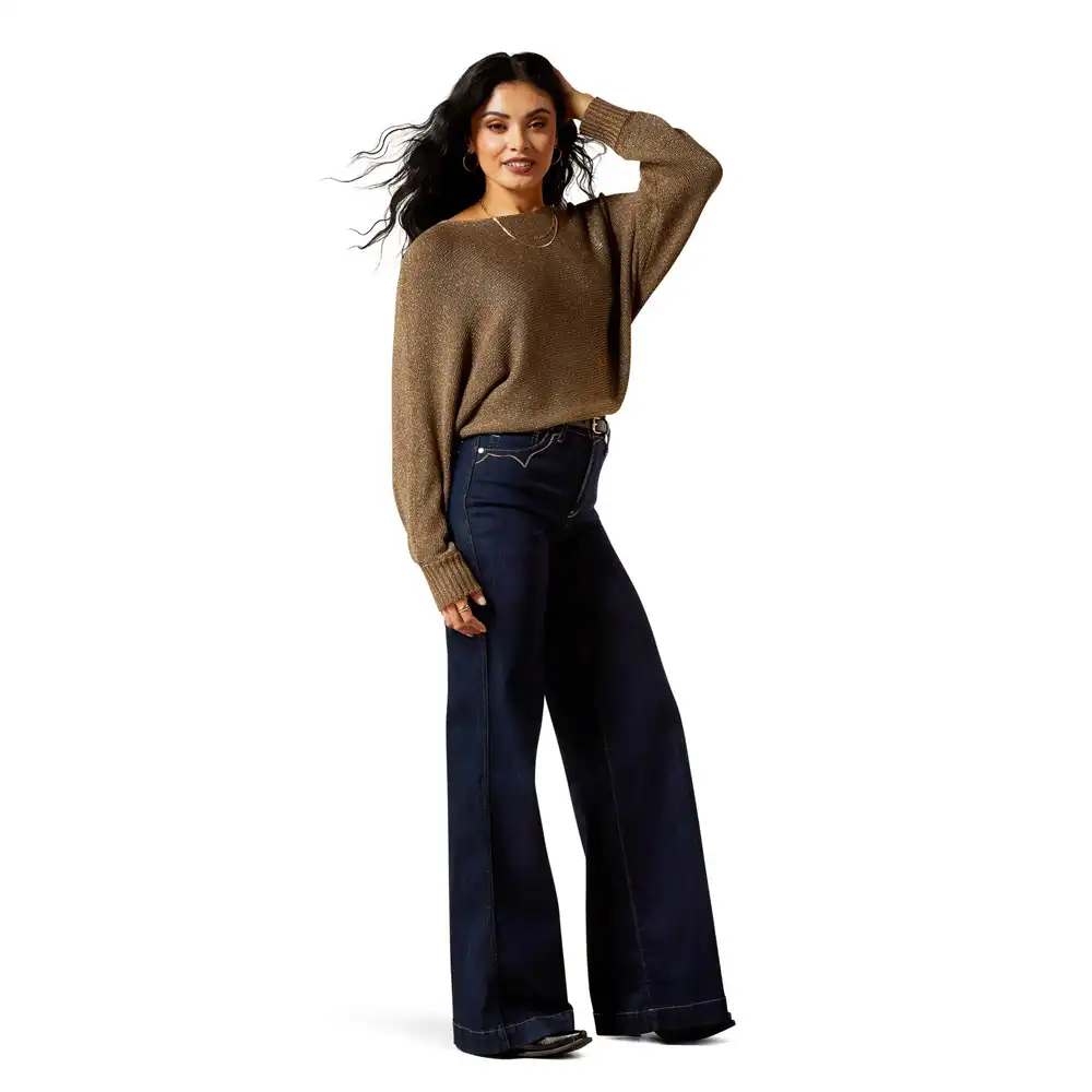 Say howdy to your new favorite sweater. A cinched hem and soft boat neckline create an effortlessly sophisticated silhouette, while shimmery gold accents add pizzaz.