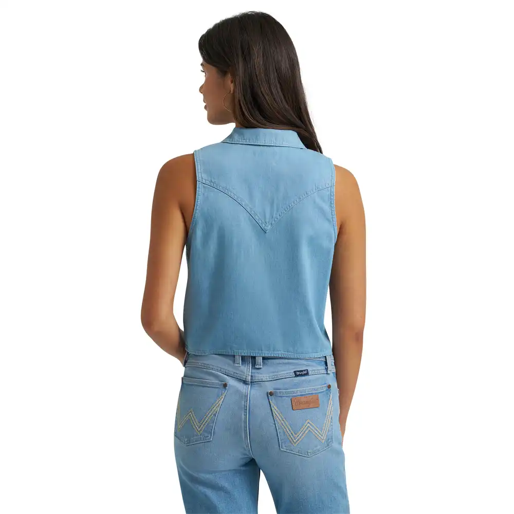 When it’s too warm to wear your go-to western snap shirt, our women’s denim sleeveless tie front shirt will be the next best option. This classic summertime staple is crafted from cotton for comfort and comes with all the iconic details, including two chest flap pockets with the ‘W’ embroidery, western front and back yokes, a pointed collar, and a full pearl snap closure. It’s cut to the perfect length for wearing with your favorite high-rise Wrangler® jeans or shorts. Plus, it ties at the waist for a relaxed feel. Finish the look with some turquoise jewelry.