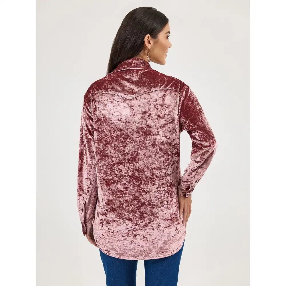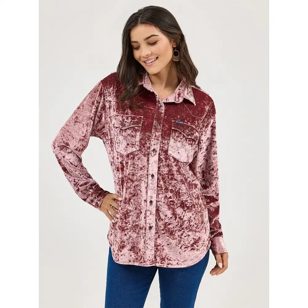 Velvet is back, and we’ve given it a Western edge in this Wrangler® women’s shirt. The boyfriend fit, long-sleeve velvet shirt features a Western one-point yoke on the front, straight back yoke with pleat, and two chest pockets. The understated silhouette’s velvet fabric gives it a striking look while its boyfriend fit offers all-day comfort you’ll love. Add your favorite Western accessories and Wrangler denim for an outfit that keeps you ahead of the latest trends.