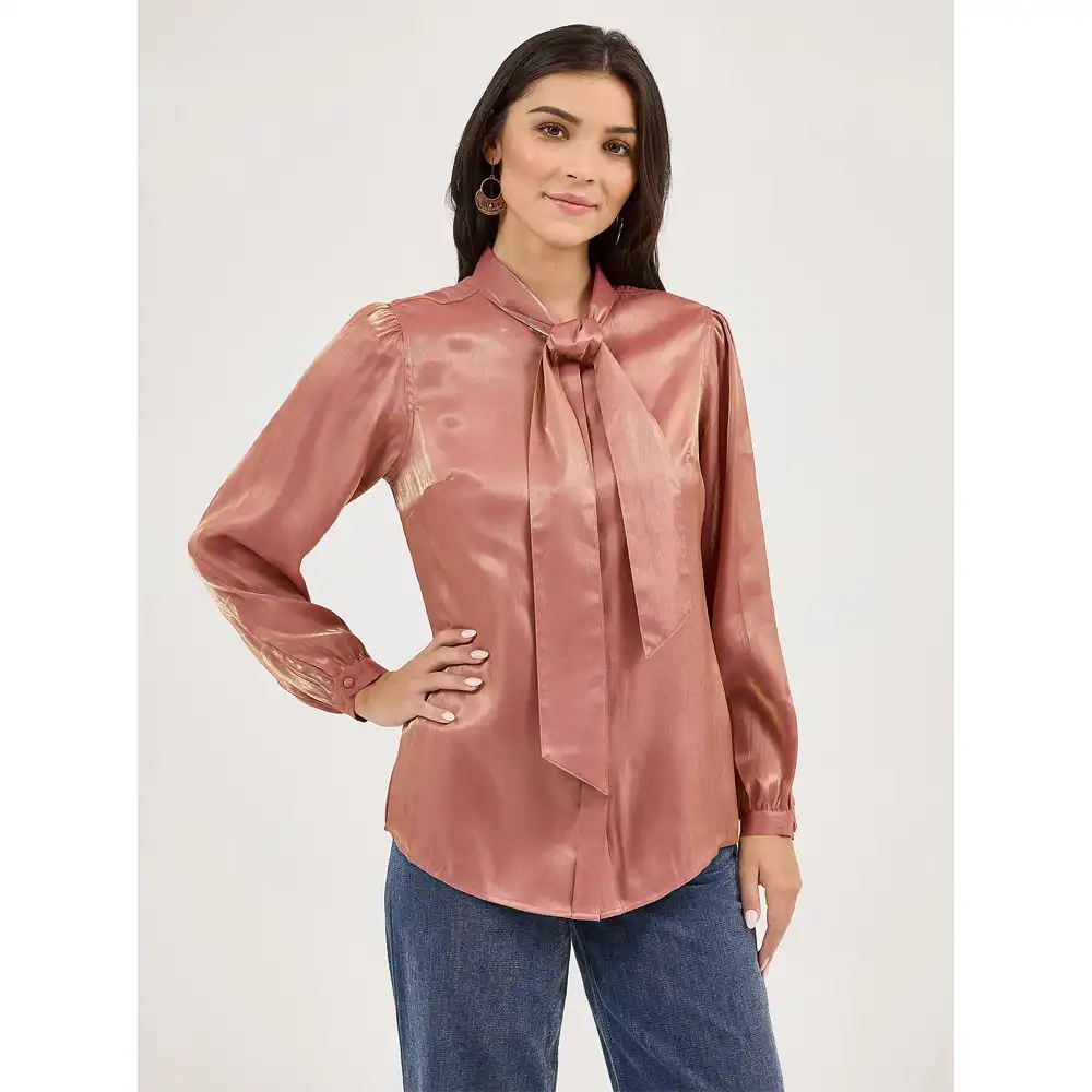 Bring some extra razzle-dazzle to any occasion with our Women’s Shimmer Tie Neck Blouse. It’s crafted from a lightweight and ultra-soft fabric blend, with a glimmering rose gold color that will instantly elevate any outfit. Don’t worry—the cowgirl flair’s there with a Western back yoke, a full button front, and a neck tie you can wear in a ladylike bow or leave long and loose. Tuck it in, leave it untucked, this top will steal the show either way.