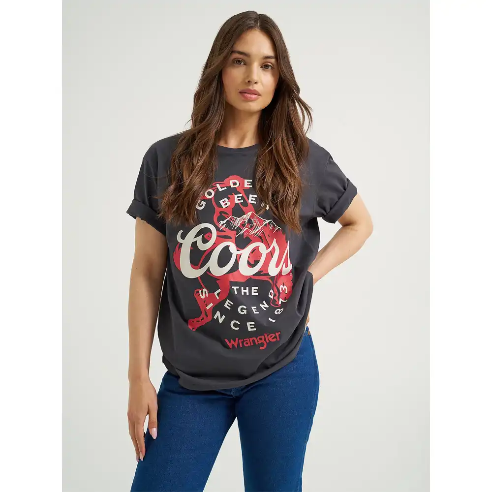 Ride all day. Raise one afterward. This Wranglerยฎ x Coorsยฎ Rodeo T-Shirt keeps its cool in every situationโfrom long days on the road to late nights at the rodeo. Itโs crafted from 100% cotton, with a relaxed fit offering a laidback look and feel. Made to pair perfectly with a Banquet, it features front and back graphics honoring the trail weโve shared for decades and our respect for the Western lifestyle.