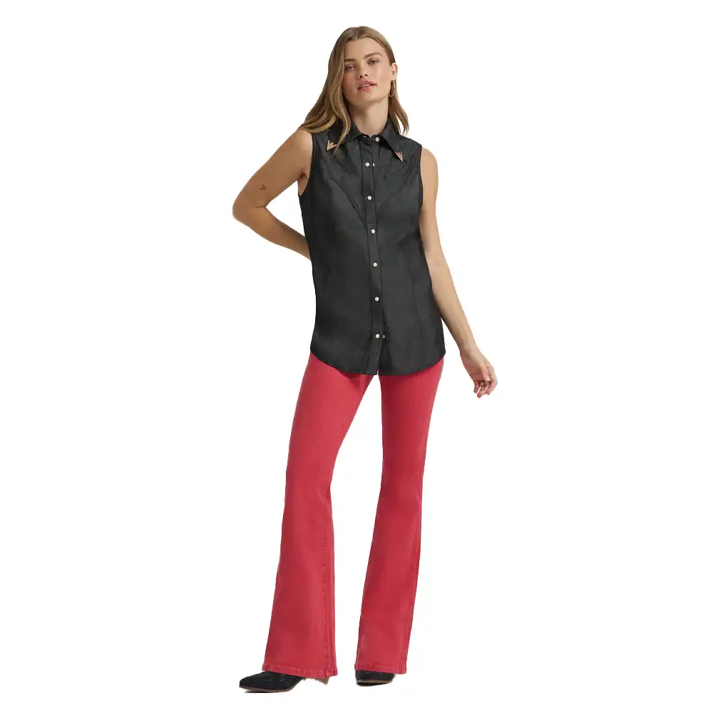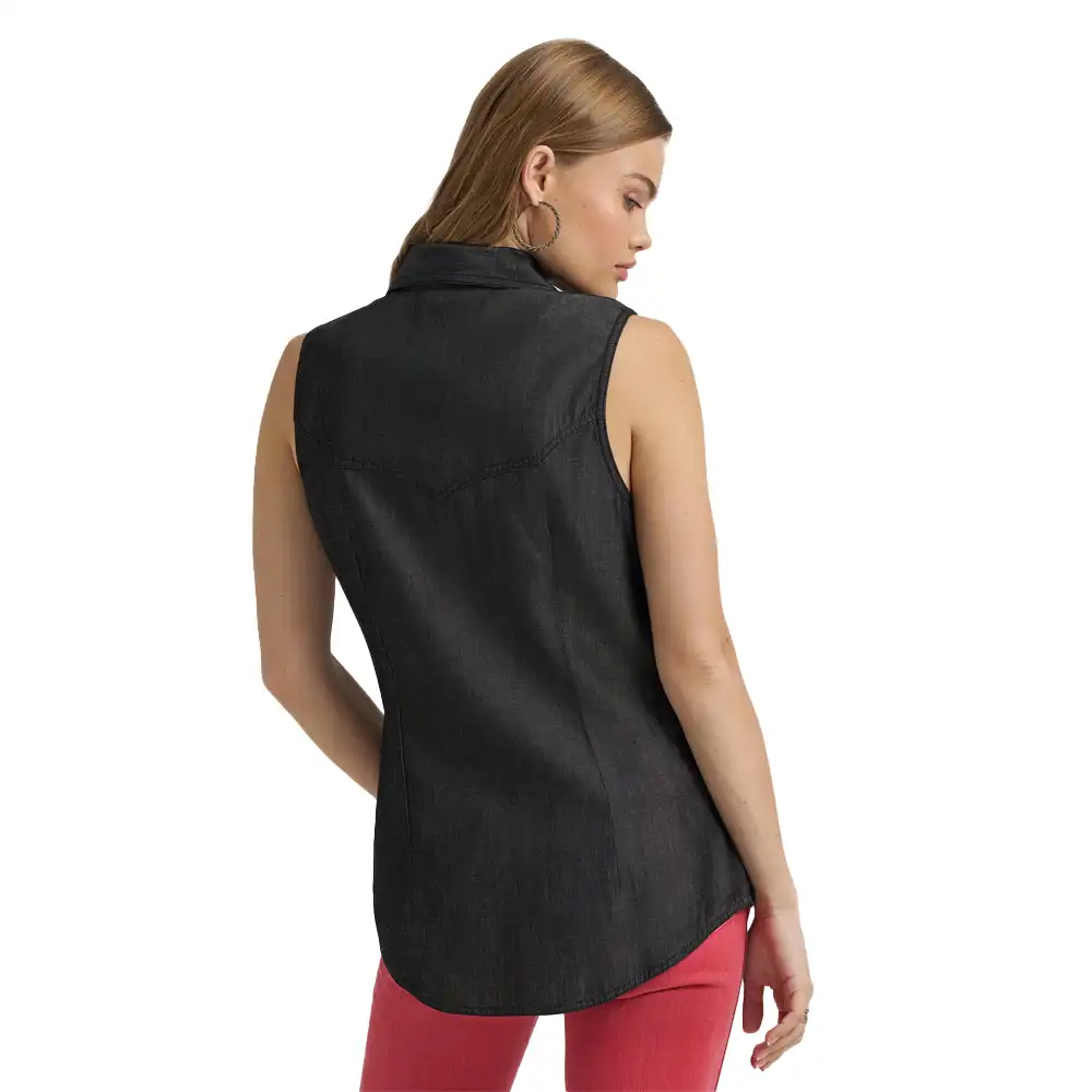 Designed to command the spotlight. The Lainey Wilson x Wranglerยฎ Black Denim Sleeveless Shirt takes center stage this summer. Itโs crafted from lightweight Lyocell denim for incredible comfort and finished with a black wash for a sleek look that goes with everything. Western details shine with an oversized collar featuring shiny copper collar tips, faux smiley pockets, a scalloped yoke, and pearl snaps. It features a figure-flattering, sleeveless silhouette thatโs perfect for summertime. And as a testament to how hands-on Lainey was in the creation of this collection, youโll find her initials embroidered at the hem.