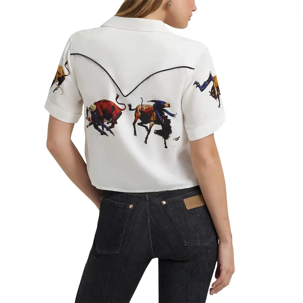 Blending laidback style with vintage cowgirl flair, the Lainey Wilson x Wranglerยฎ Camp Shirt will be one youโre wearing on repeat. Itโs woven from a soft fabric thatโs perfect for warm days, with a slightly cropped silhouette offering a boxy, effortless look. It comes with an open lapel collar, pearl snaps, piped trim along the pointed yokes, and vintage-inspired artwork featuring rough stock riders in action. Youโll find Laineyโs embroidered initials at the hem, nodding to just how hands-on she was in creating each collection piece.